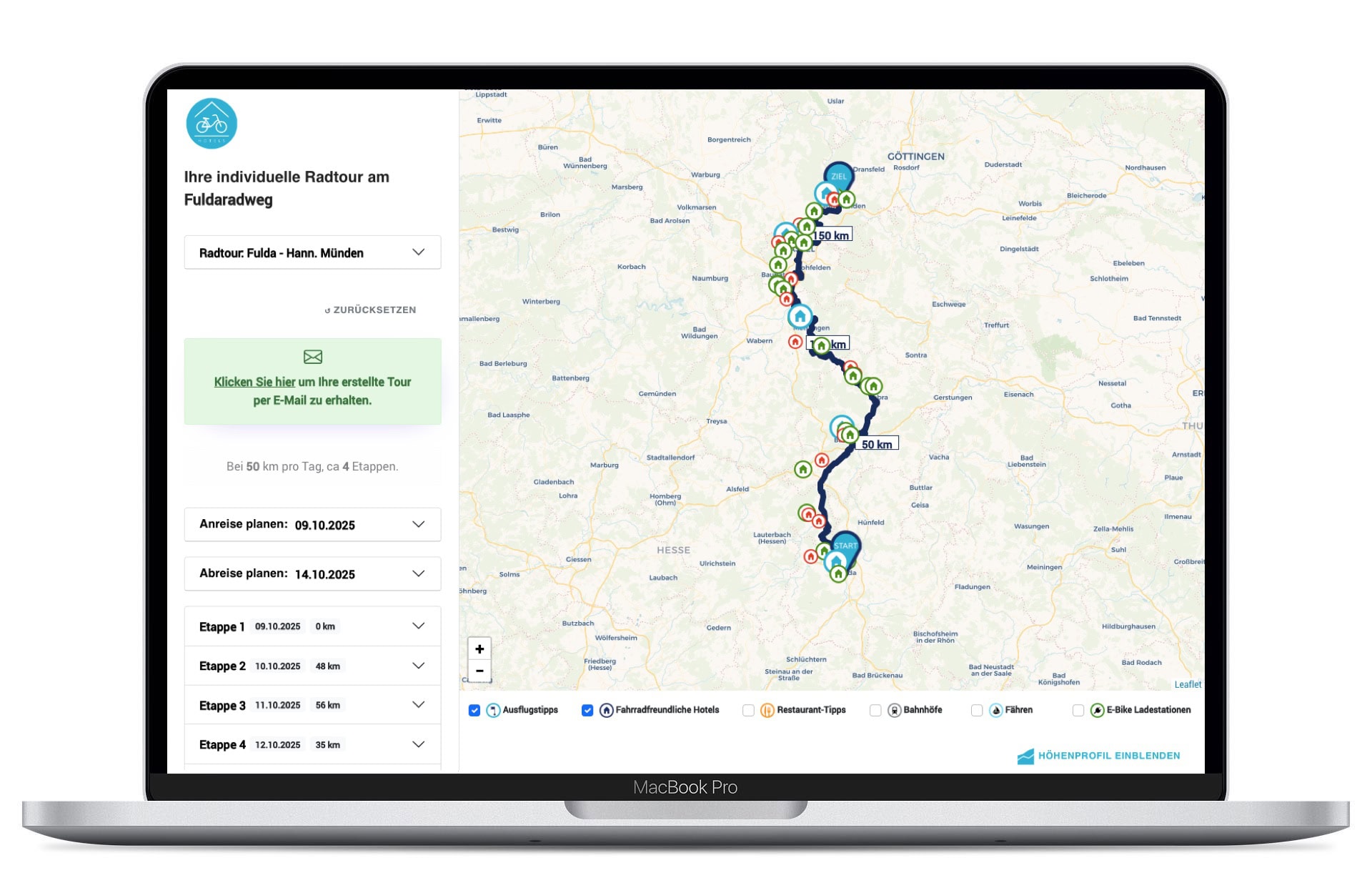 Planen Sie Ihre Radtour am Fuldaradweg ganz einfach selbst. Die Planung Ihrer individuellen Radtour war noch nie so einfach!
